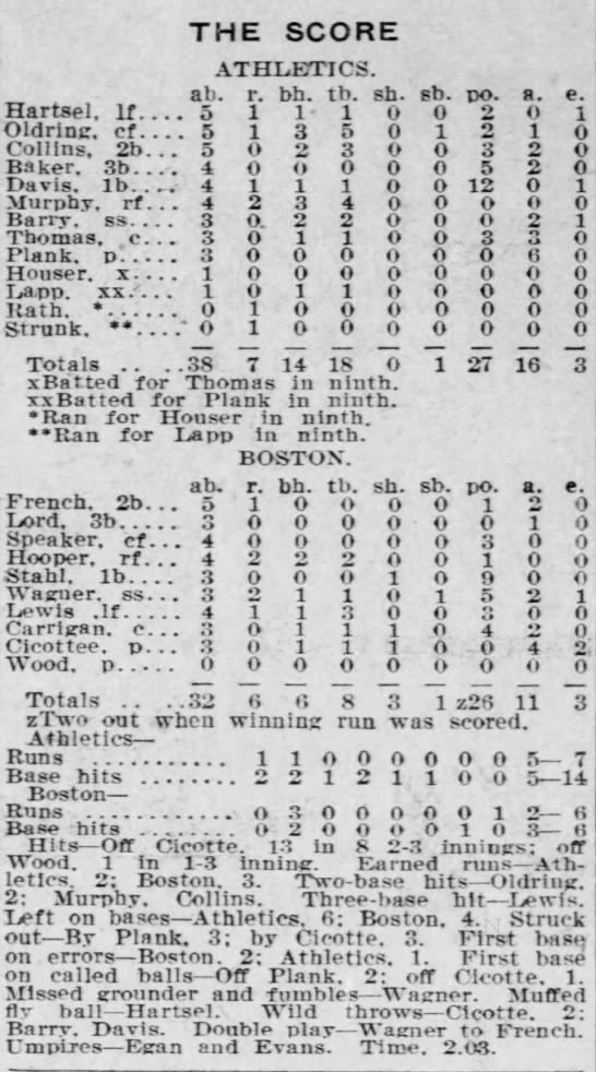 - Eddie Plank retired the Red Sox on only THREE pitches in the top of the first inning. Charlie French grounded to third, Harry Lord popped to first, and Tris Speaker grounded to first.