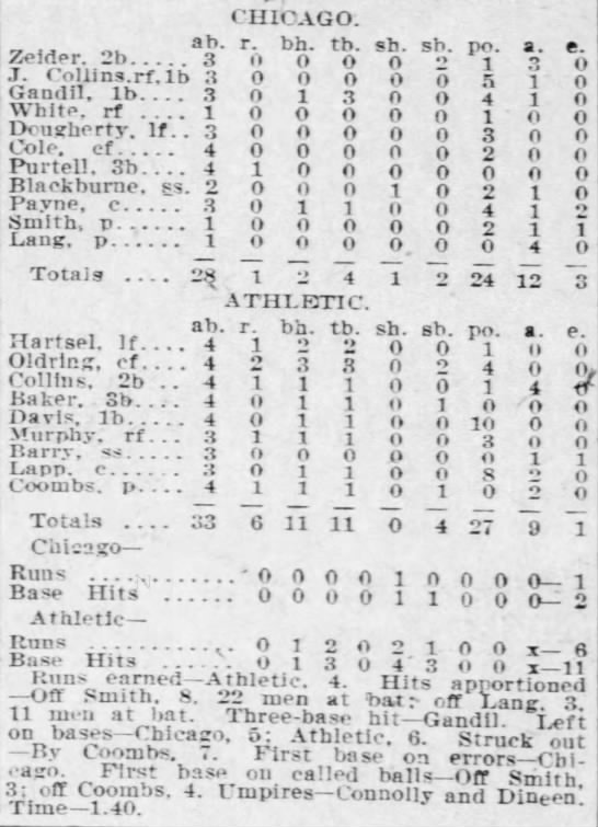 Billy Purtell followed with a high chopper to Barry for what certainly seemed like the second out of the inning. Barry let the ball play him and got caught with an in-between hop. Black Jack booted the ball – allowing Purtell to reach safely. Blackburne tried to bunt for a base hit but was retired on what amounted to a sacrifice – sending Purtell to second. Payne followed with a ringing single to center that allowed Purtell to scamper home with Chicago’s first tally of the contest. Coombs then walked Smith before coaxing Zeider to pop out to Collins for the final out.