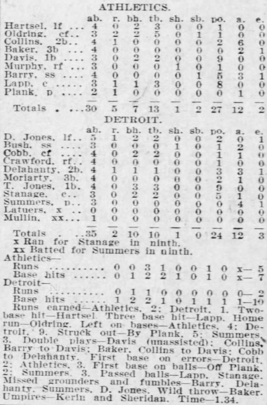 Collins put the Athletics on the board when he sliced a grounder to Bush in the hole at deep short. With his momentum taking him toward third base, Bush fired to Moriarty – retiring Hartsel heading for third – Plank scoring on the play. Baker followed by rolling a weak one to Tom Jones at first base who took the ball to the bag. The ground out advanced Oldring and Collins up a base.